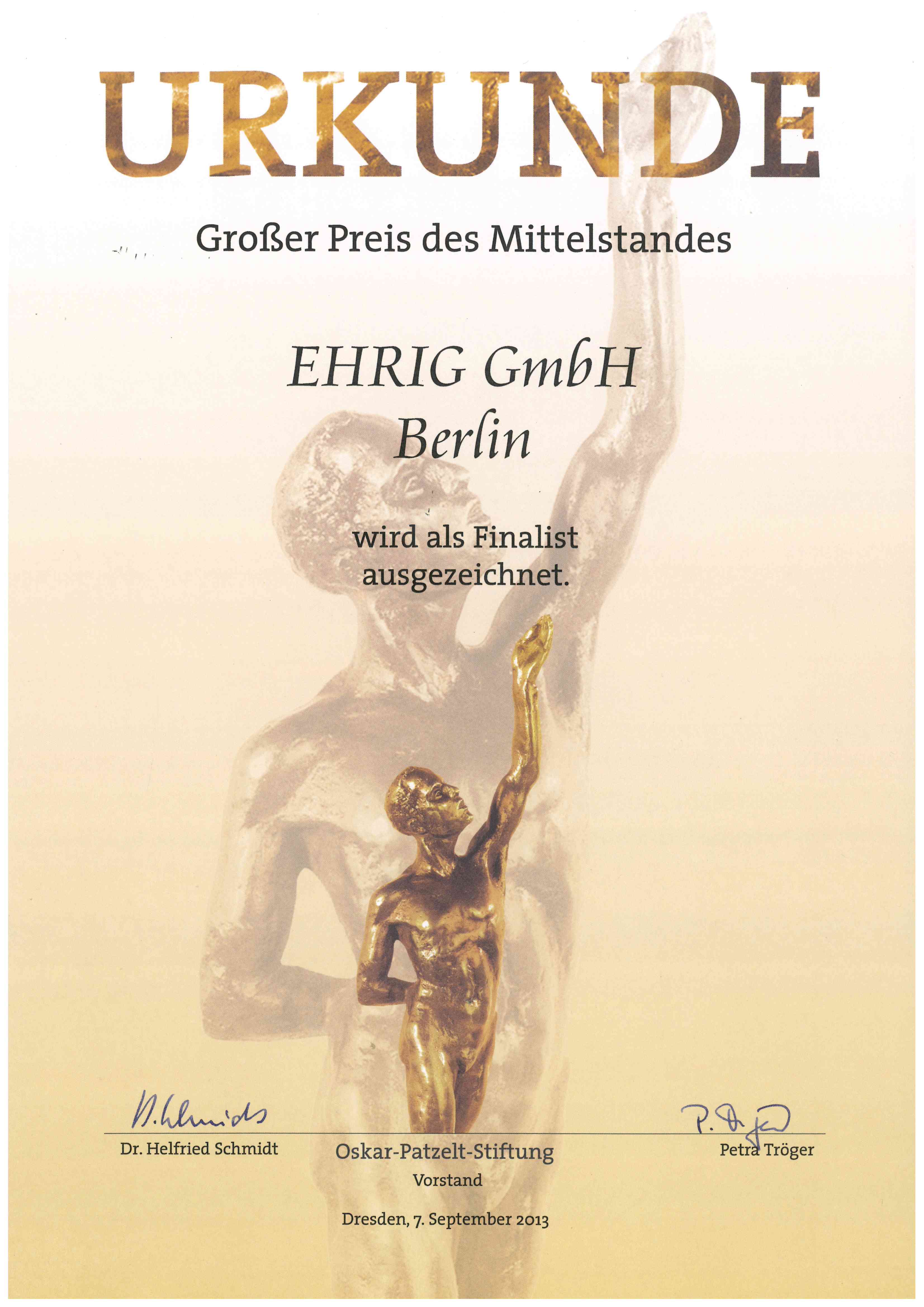 Die Ehrig GmbH wurde als Finalist beim „Großen Preis des Mittelstandes 2013“ in der Region Berlin und Brandenburg ausgezeichnet. Die Verleihung erfolgte am 7. September 2013 im Dresdner Hotel Maritim im Rahmen einer festlichen Gala. Aus 319 nominierten mittelständischen Unternehmen in der Wettbewerbsregion Berlin/Brandenburg wählten die Juroren der Oskar-Patzelt-Stiftung drei Preisträger und fünf Finalisten aus. Neben der Ehrig GmbH zählte nur eine weitere Berliner Firma zu den Gewinnern in der Region Berlin/Brandenburg, die restlichen Preise belegten Brandenburger Unternehmen. Weiterhin wurden die Besten aus den Regionen Mecklenburg-Vorpommern, Sachsen und Sachsen-Anhalt an diesem Abend geehrt, insgesamt 30 Unternehmen.